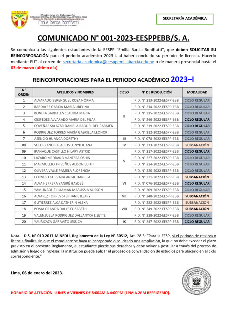 REINCORPORACIONES PARA EL PERIODO ACADÉMICO 2023–I