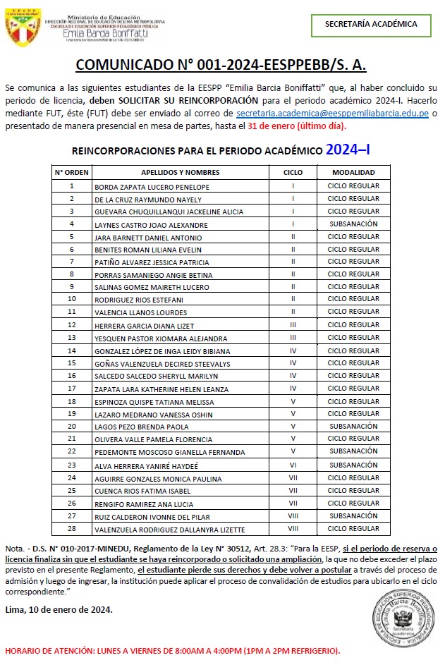 Comunicado 01-2024-EESPPEBB/SA-Reincorporaciones Comunicado 01-2024-EESPPEBB/SA Reincorporaciones para el Periodo Académico 2024