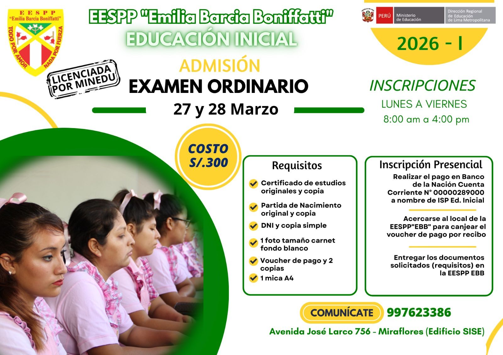 La presente publicación ofrece las orientaciones para el ingreso a este Centro de Formación Magisterial, dependiente del Ministerio de Educación. Dichas orientaciones servirán de guía al postulante para el acceso a La ESCUELA DE EDUCACIÓN SUPERIOR PEDAGÓGICA PÚBLICA “EMILIA BARCIA BONIFFATTI”, mediante un riguroso proceso de selección, en mérito a su desempeño en la evaluación en las competencias comunicación en su lengua materna, resolución de problemas matemáticos, convivencia y participación democrática, entrevista de evaluación situacional (Pensamiento crítico y creativo, Trabajo colaborativo y Tecnologías de la Información y Comunicación).